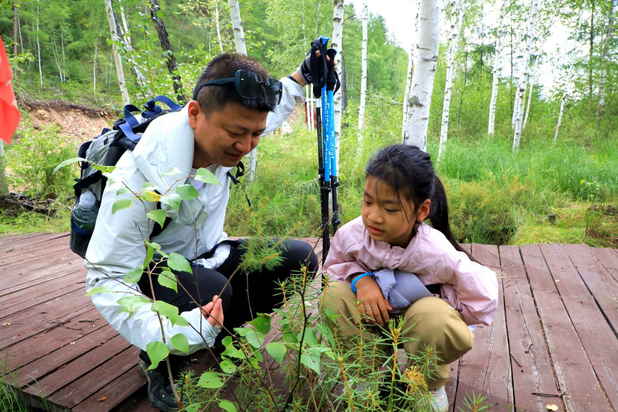 徒步途中,大家在“行走的課堂”里與自然深度對話:路旁的懸鉤子野果、杜香植物成了鮮活的“生態(tài)教材”,林間的野生蘑菇讓孩子們體驗了采摘的樂趣。來自內(nèi)蒙古包頭市的劉逸馨感慨:“習慣了都市里的高樓和柏油路,這里的一草一木都在傳遞自然的能量,太接地氣了?!睆?—21線北極島景區(qū)南大門出發(fā)后,40人的隊伍始終保持著強大的凝聚力,沒有一人掉隊。
