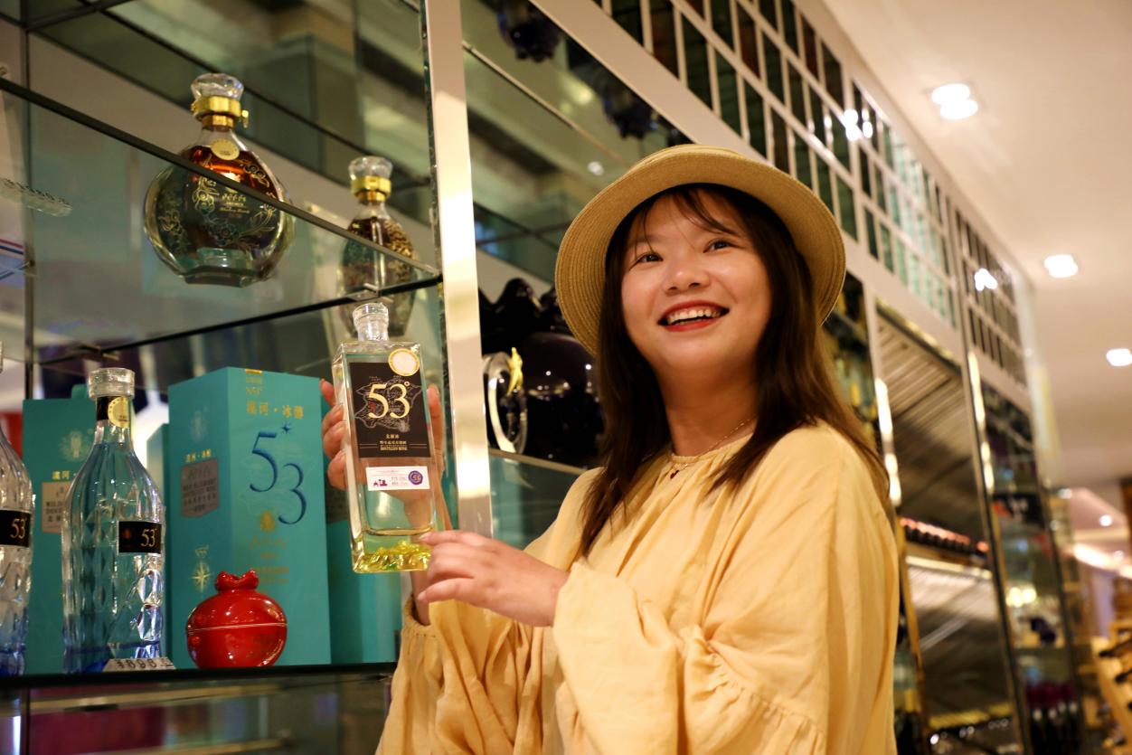 網(wǎng)名為“簡簡環(huán)游記”的網(wǎng)絡(luò)達人被北極冰藍莓酒莊生產(chǎn)的北緯53度藍莓蒸餾酒所吸引,為其主動代言(王力 攝)