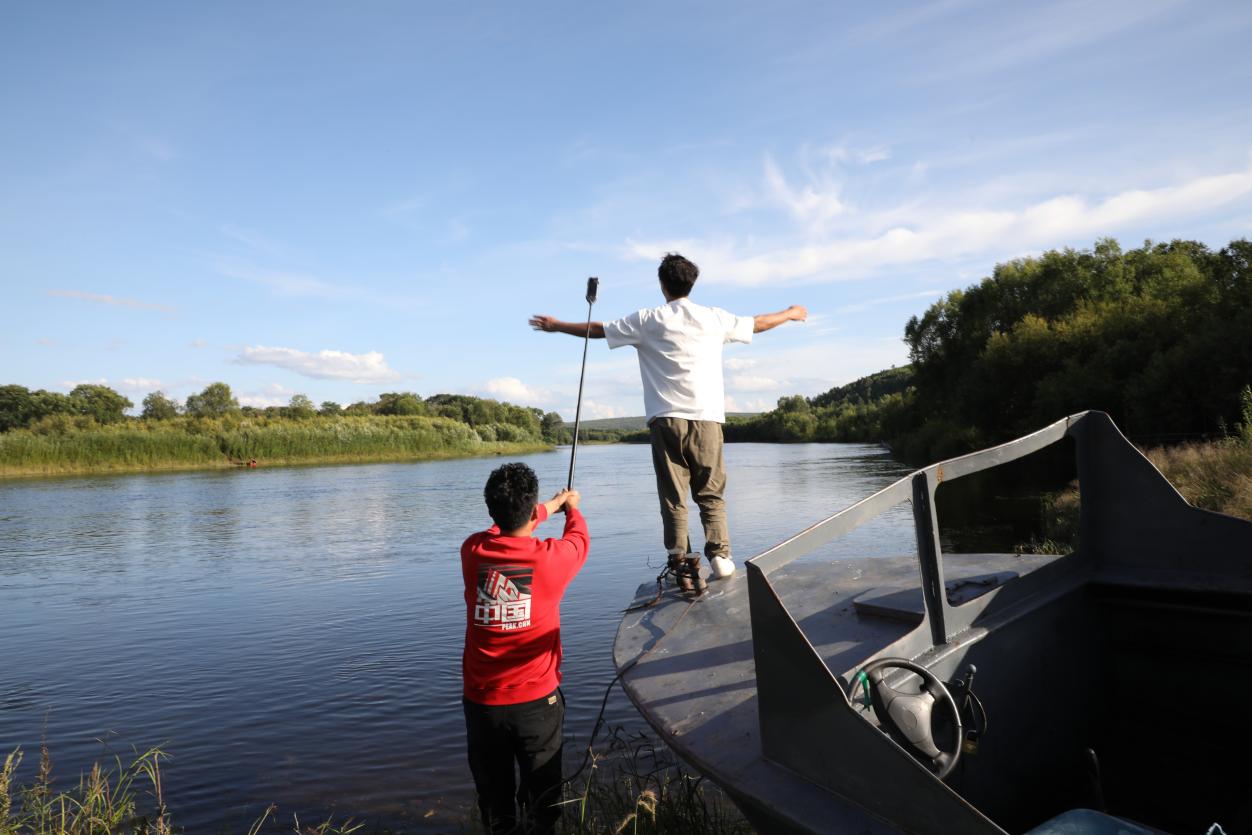 “霧都陳sir”(左)和“Mr文的旅行”(右)在在額木爾河入江口取景拍攝(王力 攝)