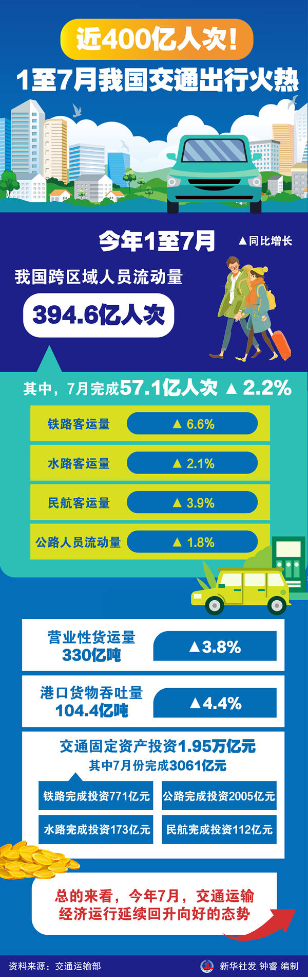 “7月份,完成跨區(qū)域人員流動量57.1億人次,同比增長2.2%,增速較上月回升0.7個百分點。分方式看,鐵路、水路、民航客運量同比分別增長6.6%、2.1%和3.9%,公路人員流動量同比增長1.8%?!苯煌ㄟ\輸部新聞發(fā)言人李穎說。