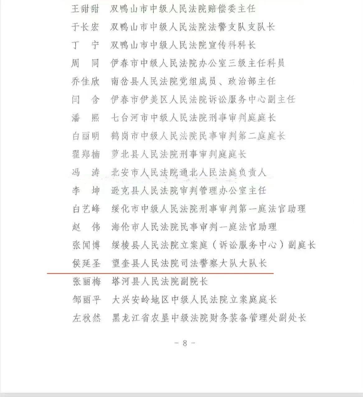 黑龍江經(jīng)濟(jì)網(wǎng)訊(董慧瑩 徐金玲 記者馬朝林)近日,黑龍江省高級(jí)人民法院印發(fā)《關(guān)于表彰全省法院先進(jìn)集體、先進(jìn)個(gè)人暨全省優(yōu)秀法院、優(yōu)秀法庭和優(yōu)秀法官的決定》,對(duì)全省法院系統(tǒng)內(nèi)表現(xiàn)卓越、貢獻(xiàn)突出的集體與個(gè)人予以隆重表彰。在此次表彰中,望奎縣人民法院法警隊(duì)隊(duì)長(zhǎng)侯延圣憑借其過硬的政治素質(zhì)、精湛的業(yè)務(wù)能力和突出的工作業(yè)績(jī),光榮獲評(píng)“全省法院先進(jìn)個(gè)人”稱號(hào)。