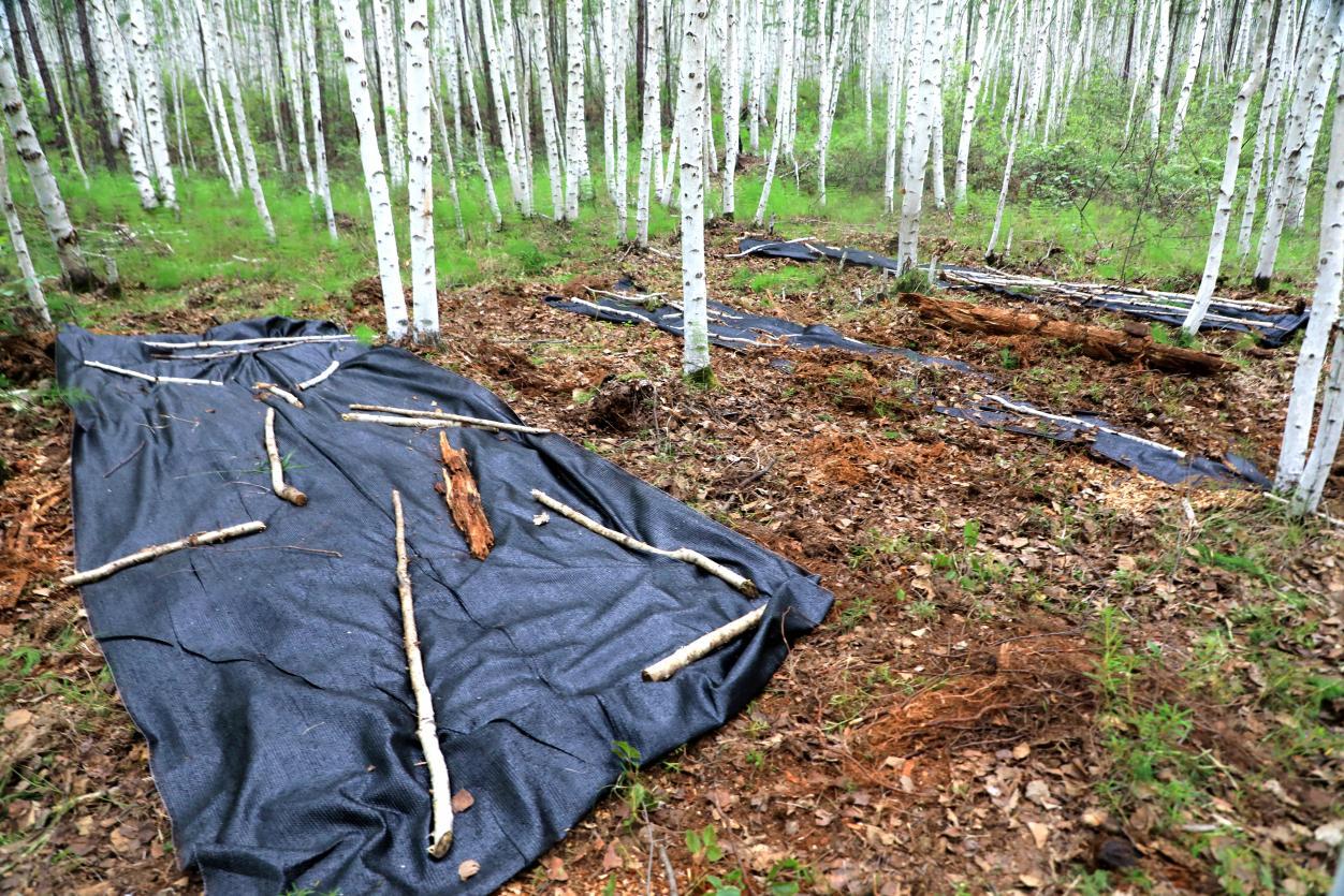 阿木爾林業(yè)局工作人員在為培育的林下赤松茸覆蓋遮陰網(wǎng)(王力 攝)