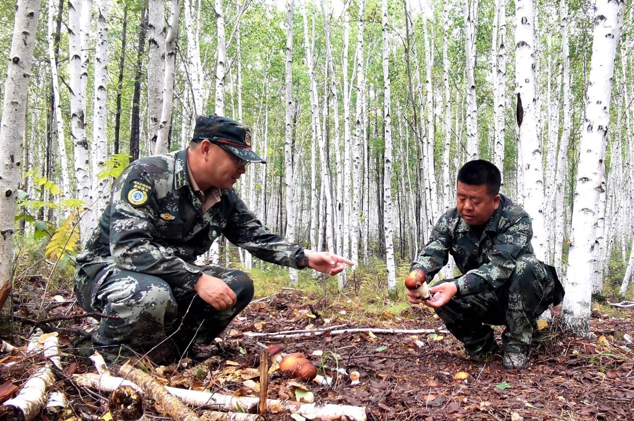 阿木爾林業(yè)局工作人員在查看林下培育赤松茸長勢情況(王力 攝)