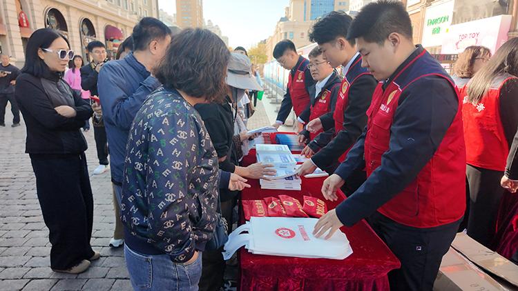 工作人員發(fā)放宣傳手冊(cè)、宣傳單