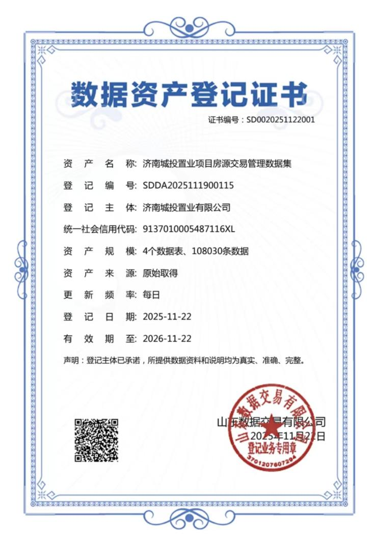 近年來(lái),集團(tuán)深入探索房源數(shù)據(jù)資產(chǎn)化實(shí)踐路徑,著力打造房地產(chǎn)行業(yè)精細(xì)化、數(shù)字化服務(wù)新引擎。城投置業(yè)公司特邀專業(yè)會(huì)計(jì)師事務(wù)所、資產(chǎn)評(píng)估單位,系統(tǒng)梳理數(shù)據(jù)資源,經(jīng)多輪分析評(píng)估,確定“濟(jì)南城投置業(yè)項(xiàng)目房源交易管理數(shù)據(jù)集”為入表的數(shù)據(jù)資產(chǎn),11月17日成功完成入表,并于近日正式取得登記證書(shū)。